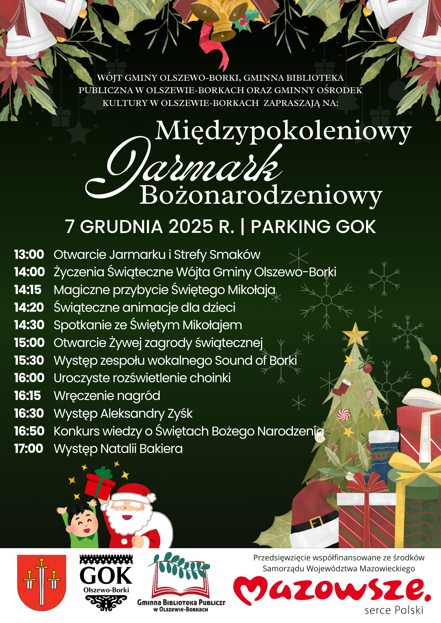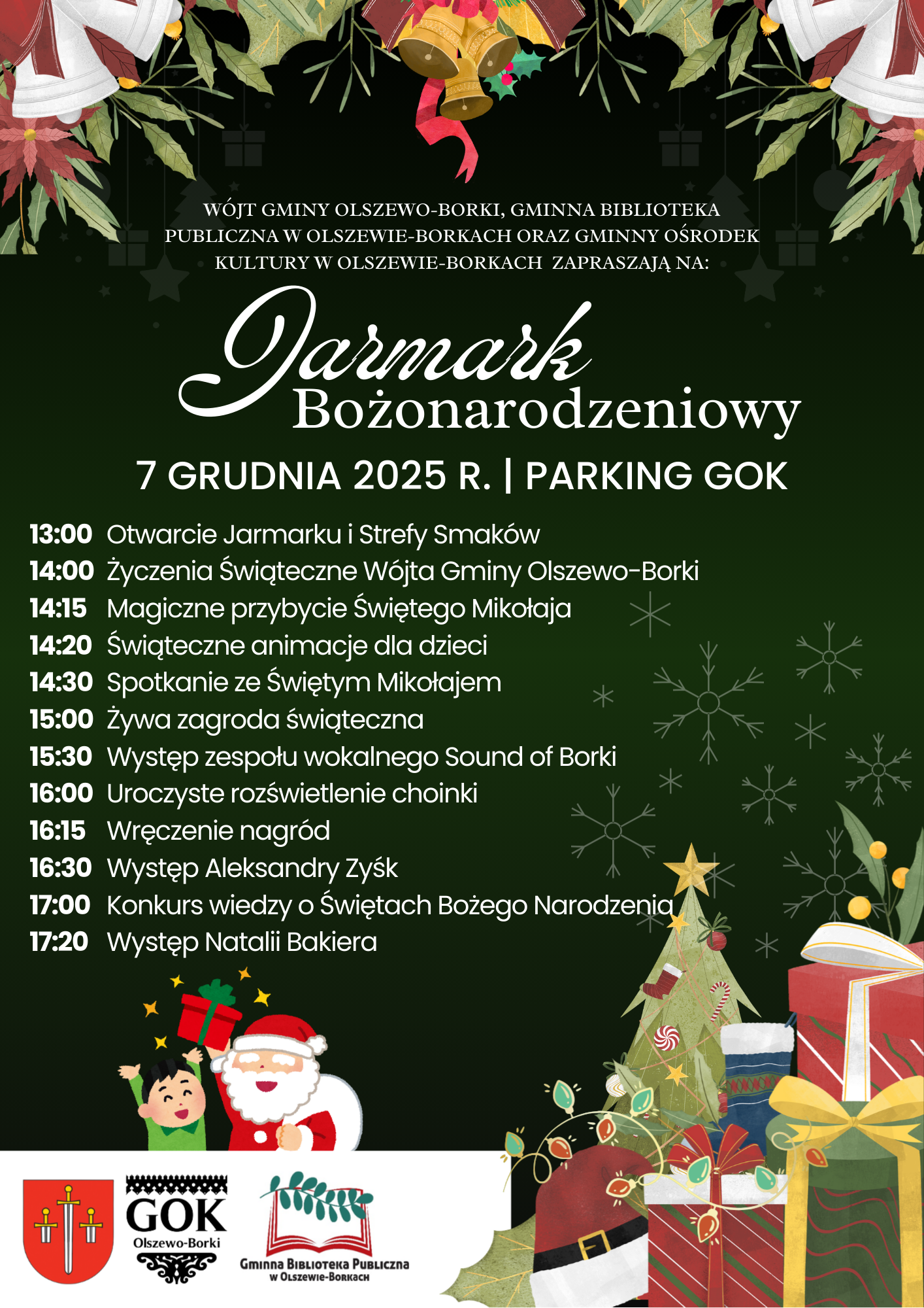 Wójt Gminy Olszewo-Borki, Gminna Biblioteka Publiczna oraz Gminny Ośrodek Kultury serdecznie zapraszają na wyjątkowy Jarmark Bożonarodzeniowy, który odbędzie się 7 grudnia 2025 r. na parkingu GOK!